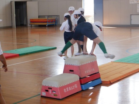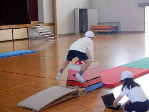 開脚跳びのポイントを意識するため、段階を踏んだ場を設定し練習に取り組んでいました。