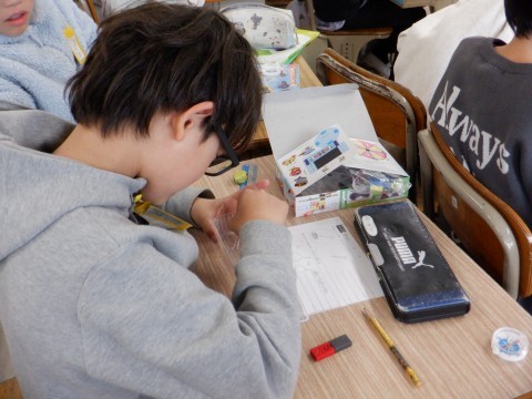 これまで学習してきた豆電球と紙コップを使ってライトをつくっていました。