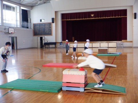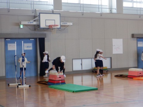 開脚跳びのポイントを意識するため、段階を踏んだ場を設定し練習に取り組んでいました。