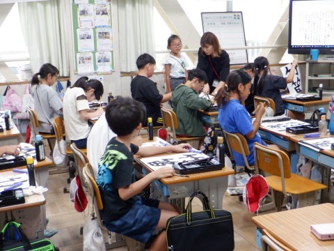 理科室で「とじこめた水の性質」の実験に取り組んでいました。とじこめた水は押し縮めることができるのか、確かめていました。