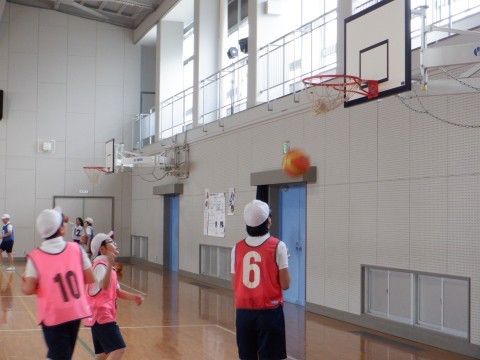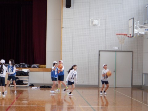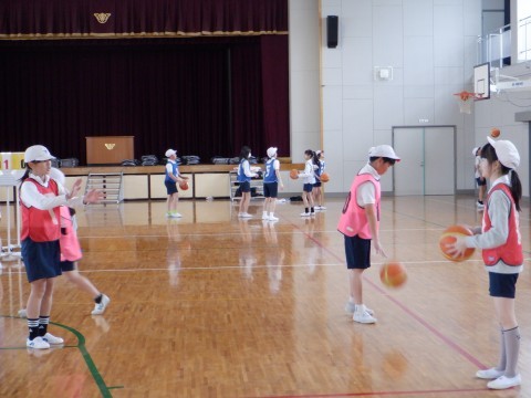 5年3組の体育では、バスケットボールに取り組んでいました。
