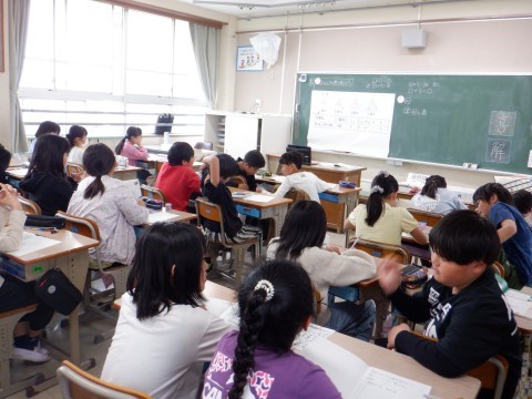 5年2組では、4年生で学習した漢字の復習チェックに取り組んでいました。