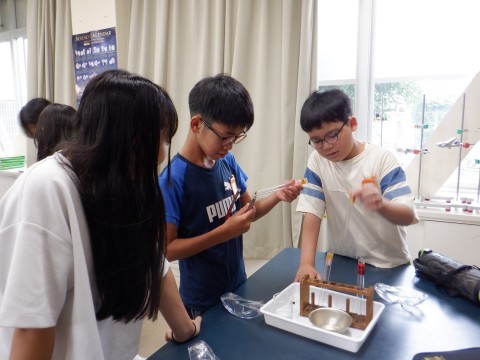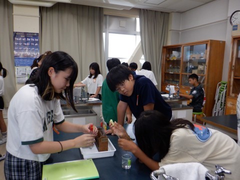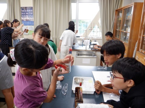 「水溶液の性質」の学習で、「蒸発して出てきた粉はもとの金属と同じか」ということを確かめる実験に取り組んでいました。