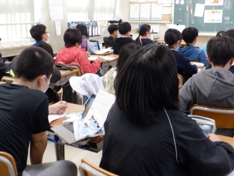 1930年代のアメリカが舞台の物語「ぼくのブック・ウーマン」を読み、登場人物カルと同じような経験について考えることをめあてに、ノートに作文していました。