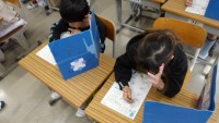 図工で自分の顔を描きます。頭と体のバランスや,部分に気をつけてかいていきます。