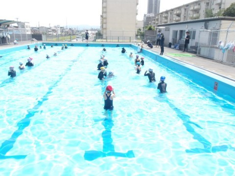 本日、はじめてのプール授業がありました。水の冷たさに大はしゃぎしながら、水中で走ったり、顔を付けたりすることを楽しむことができました。
