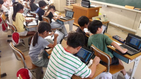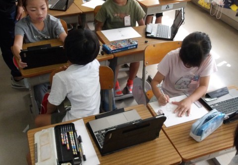 体育大会の絵を描いています。タブレットで画像を見たり,