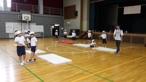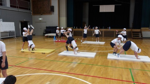 マット運動に取り組んでいます。今日は少し難しい倒立にも