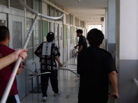 本日,不審者侵入想定訓練を実施しました。不審者役が包丁(おもちゃ)を持って,教室を叩きながら徘徊しました。