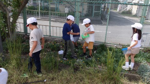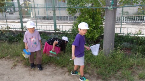 虫網とカゴをもって,校内にいる虫を捕まえています。