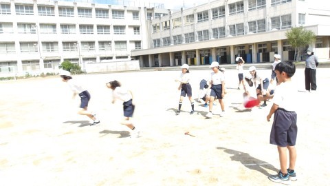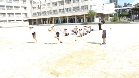 短距離走のタイムをはかっています。スタートの合図を聞いて