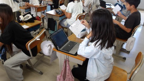 周りの座席の人たちとお互いに感謝の気持ちを手紙に書いて伝え合って