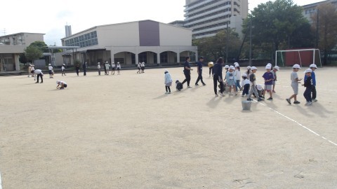 体育大会の練習に向けて,全学年で運動場の石拾いを実施