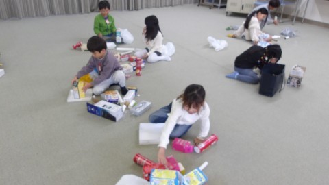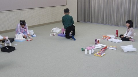 おうちから持ってきた箱や,トイレットペーパーの芯などを組み合わせて