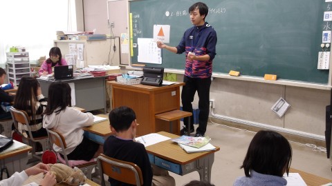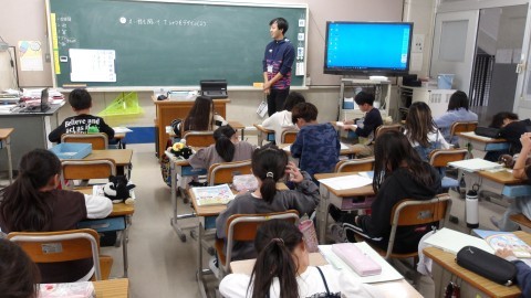 さまざまな形の英語を聞いて,デザインをするという学習をしています。