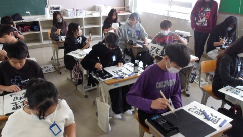 「理想」という字を毛筆しています。ドンっと大きく半紙をつかう子もいれば,