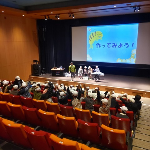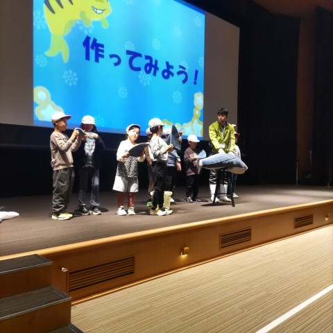 ジンベエアカデミーでお話をきいています。代表の子がジンベエザメを組み立てていきます。
