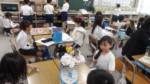 重さの学習をしています。今日は実際にはかりを使って,重さを