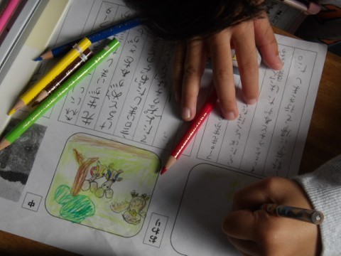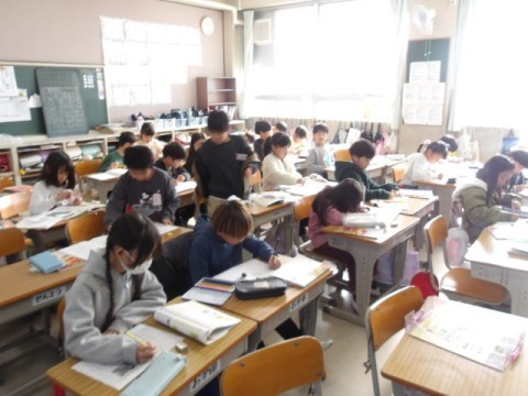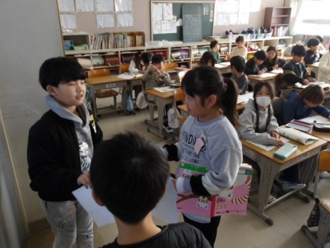 「お話の作者になろう」というめあてを基に,自分たちでお話を作っています。挿絵も考え,楽しい作品が仕上がっています。完成した児童は友だちと交換し合っていました。