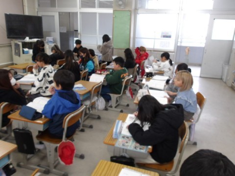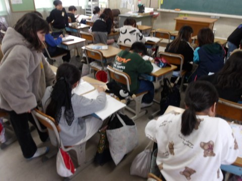 分数のまとめ問題に取り組んでいます。友だち同士で教え合う場面もありました。