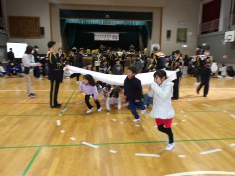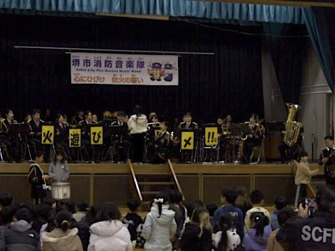 堺市,高石市,狭山市の消防士が集まり,消防音楽隊として学校に来てくださいました。子どもたちの大好きな歌を演奏してくれ,みんな大喜びでした。児童の座っている間を演奏しながら練り歩いたり,児童代表に演奏してもらったりしながら一緒に楽しむことができました。お忙しい中,お越しいただいた消防士の方々,どうもありがとうございました。
