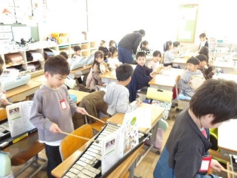 「子犬のマーチ」を鉄琴やタンバリン,トライアングル,鍵盤ハーモニカなどを使って合奏しました。みんな楽しく活動できました。
