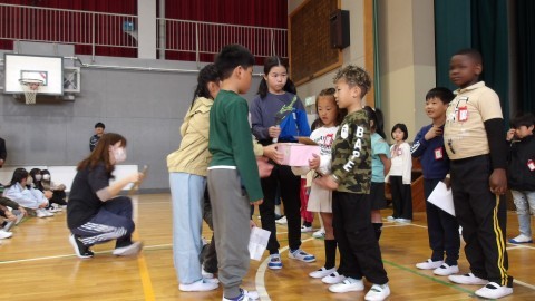 4月に入学した1年生と2~6年生が初めて体育館で対面しました。