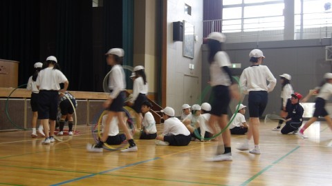 フラフープを転がしてそれを飛び越える運動もしました。
