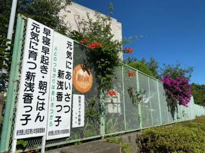 東門の北側フェンスには色鮮やかな夏の花が咲いています。