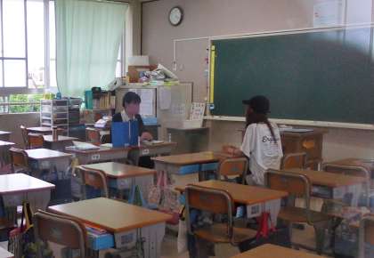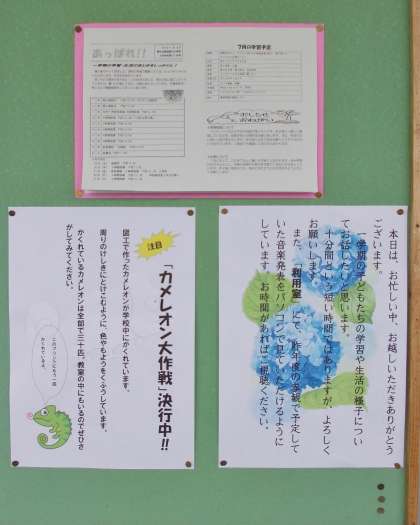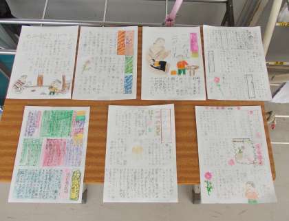 4年生の教室の前には、先日図工で取り組んだ「カメレオン大作戦」に関する掲示物や、国語で学習した「一つの花」のまとめ新聞が展示されていました。