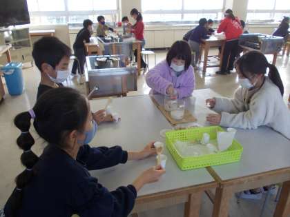豆腐が固まるまでの時間を使って「大豆からできる食べ物」クイズが出されました。みそやなっとう、きなこや厚揚げ、本当にたくさんの種類がありますね。
