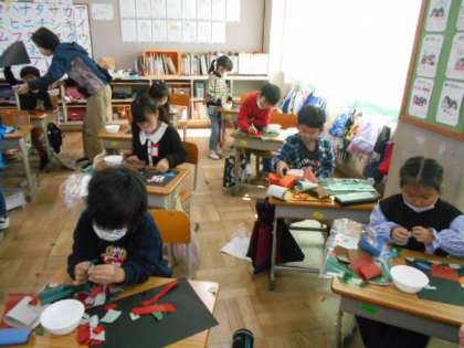 色紙を手でちぎって黒の画用紙にそれぞれが表現したいものを貼り付けていきました。いろいろな表現方法があって見ていると楽しくなりますね。