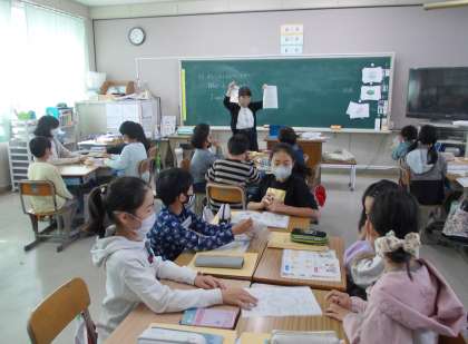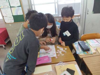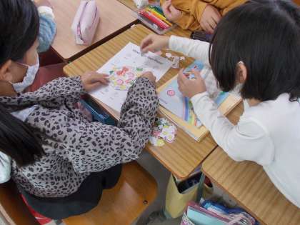 グループでピザを作っています。トッピングの名前を学習しながら色とりどりの美味しそうなピザができていますね。