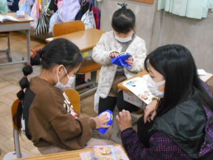 時計の学習をしています。ペアになって時計の読み方を出し合って楽しみました。
