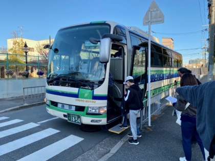 出発式を終えて、予定より少し早くバスに乗り込み、これからキッザニア甲子園に向かいます。