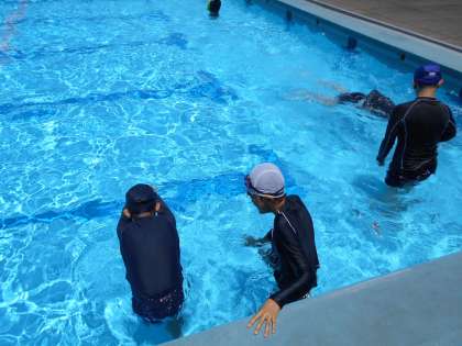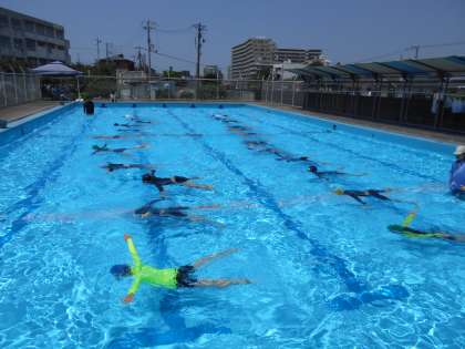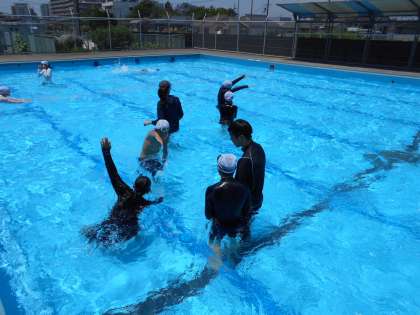 前回の泳力テストの結果をもとに3人グループを作り、教え合い活動をしました。みんなでぐんぐん上達していきましょうね。