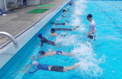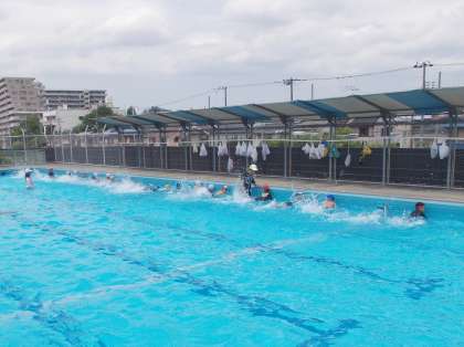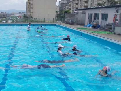 「けのび」の練習に続いて、バタ足の練習に入っています。膝を曲げずに動かすことが大切です。