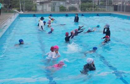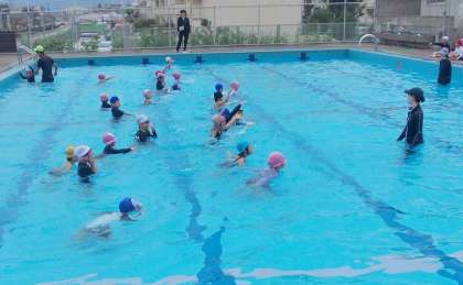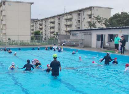 ワニになって進んだり、フラフープの輪をくぐったり、気持ち良さそうにプールを楽しんでいました。