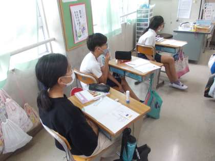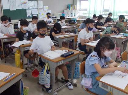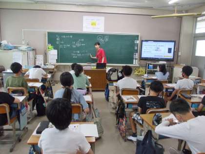 分数の割り算です。明日から修学旅行ですが、集中して授業に取り組めています。さすが最高学年ですね。
