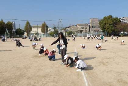 それぞれ学年に分かれて、分担場所の石やゴミを拾いました。みんなの協力で運動場がとても活動しやすくなりました。ありがとうございました。