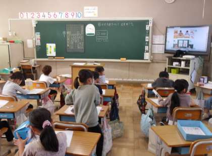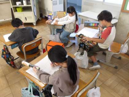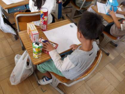 家から持ってきた色々な形の箱を写し取って、絵を描いていました。形の特徴をうまく生かしているようです。