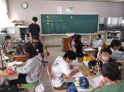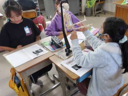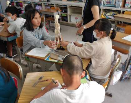 人体の骨の模型が配られて、関節のある場所についてグループで考えていました。