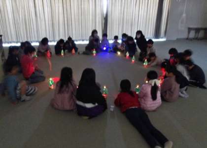 図工の授業で作ったクリスマスツリー型キャンドルを、多目的室で点灯させました。色とりどりライトがとてもきれいです。