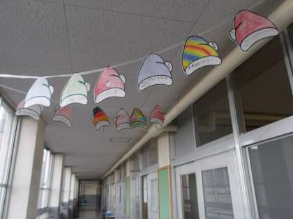 また、3年生の廊下には、12月の生活目標をサンタの帽子に書いた掲示物が飾られています。