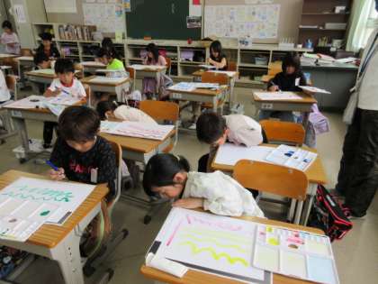 2年生になって初めての絵の具です。色々な線を描く練習をしました。