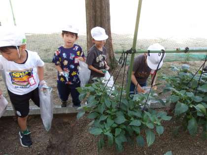 大きななすびやピーマン,真っ赤なミニトマトを収穫しました。
