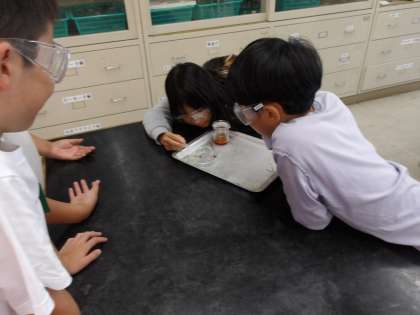 初めて扱う溶液に子どもたちは少しこわがっていました。