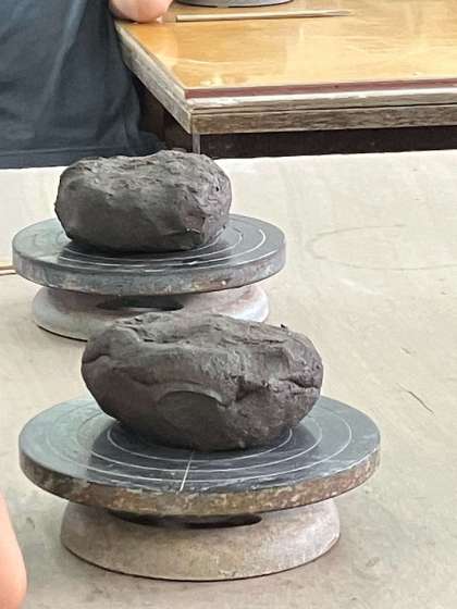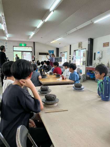 陶器の作り方の説明を受けています。