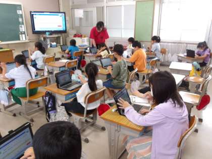 子どもたちがパソコンを使って,長さの勉強を進めています。