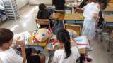 太陽と月の学習について、まとめをしています。 担任の先生が太陽と月の模型を使って...